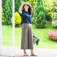 裾に深めのベンツを入れた、美シルエットのワイドパンツです。さらりとした肌ざわりの、ポリエステル/レーヨンの布帛生地を使用。