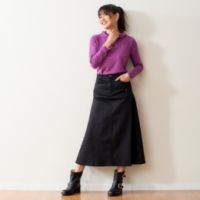 スカートの脇にマチ布を付け、フレアー分量を出した変形シルエットのロングスカートです。膨らみが出すぎないように、腰のあたりは程よくフィットし、裾に向かって広がりを持たせたシルエットに。