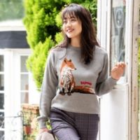 横を向いたキツネの柄を、前身頃にジャガード編みで施した、キャッチーなニットプルオーバー。ドロップショルダーで肩山を落としたデザインなので、締めつけ感も少なくゆったりとした着心地です。
