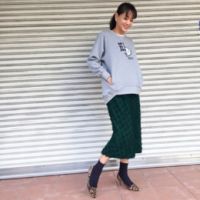ジャガードの布帛生地を使用。膝下丈の大人っぽいタイトスカートです。楕円形の模様に合わせて表面がフリンジ状になった、特長のある生地。