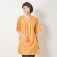 大ぶりのギンガムチェック柄が可愛らしいチュニックです。お腹まわりをカバーするタック使いで、ゆったりとしたシルエットにデザイン。