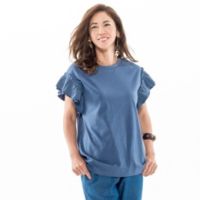 カットソーと布帛のダブルフリルで、袖をデザインしたTシャツです。身頃をシンプルにすることで甘くなり過ぎず、首元も横広のラウンドネックにして大人可愛いデザインに。