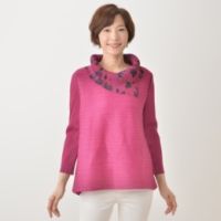 衿元に立体モチーフをあしらい華やかに仕立てた、カットソープルオーバーです。ストレッチ性のあるカットソー素材を使い、動きやすく。