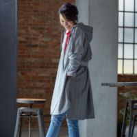無地見えする変形織りツイル素材と、グレンチェック柄生地をコンビ使いした、デザイン性のあるコートをご紹介します。