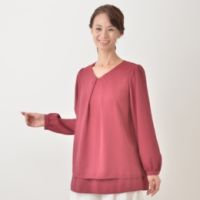 タックを寄せた胸元にメタルモチーフをあしらった、おしゃれなチュニックです。落ち感があり、しなやかな肌触りで透けにくく、しわになりにくいジョーゼットを使用しました。