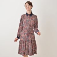 襟元のフリル使いが可愛らしいワンピースです。シワになりにくくストレッチ性もあり、肌触りもソフトな混紡のカットソーに、プリントを施した素材を使用。