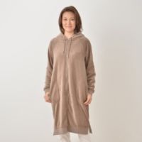 マシュマロのようなソフトな手触りの、ふわふわで柔らかい起毛フリース素材。膝まで温かく包みこむ、100cm丈のロングパーカーです。