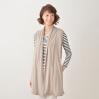 ドレープ風の衿とバックベルトがポイントのジレです。シンプルながらスタイリッシュなシルエット。ヒップをすっぽり覆うロング丈で、縦ラインを強調してスタイルをすっきりと見せてくれます。