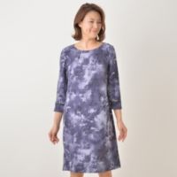 モダンでエレガントな、グラフィック柄をプリントしたサックドレスです。特有のストレッチ性と布帛ライクな仕立栄えの両面を備えたニット素材で、高級感があります。