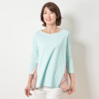 大人のカジュアルスタイルをオシャレに彩る、プリント切替えのチュニックです。後ろ裾部分に、シフォンのチェック生地を切替え使いしたデザイン。