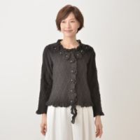 ギンガムチェックの素材に、軽やかなコインドットプリーツを散りばめたジャケットです。衿ぐりの共地フラワーモチーフが、お顔まわりを華やかに演出。