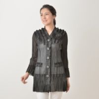 柔らかなチュールで、フェミニンなロングジャケットをおつくりしました。繊細なチュールに沢山のリボンとスパンコールを縫い付けた素材を使用。