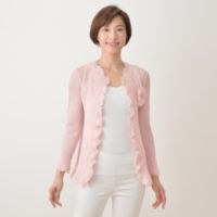 華やかなフラワーモチーフが目を引く、あたたかみのある糸で仕立てたニットカーディガン。ケーブル風のラインでひし形を編み上げた身頃に、たっぷりのフラワーモチーフを散りばめました。