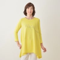 雰囲気のある手書き風ロゴをプリントしたチュニックです。たっぷりと分量をとったイレギュラーヘムが、女性らしいシルエットを演出。