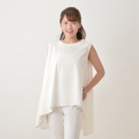 織地はシフォンを、編地は天竺素材を使用したプルオーバーです。たっぷりと分量を取り、ふんわりと揺れるフレアとイレギュラーヘムで、女性らしいデザインに。