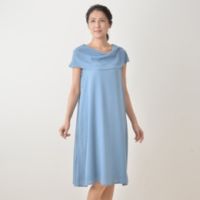 シャンブレー素材を使用した、さらりとした肌触りの良いワンピースです。首につくことがない離れた衿の、ファーラウェーカラーがポイント。