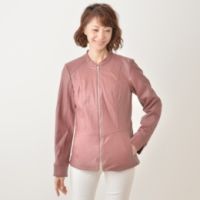 スタイリッシュなレザー調ジャケットのご紹介です。やさしい色味と、女性らしいシルエットがつくりやすい、切り替えしの効いたペプラムシルエット。
