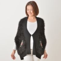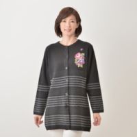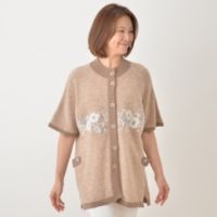 小さな針目で施したプチポアン刺繍をコサージュのようにあしらい、上品に仕上げたカーディガンです。暖かくソフトな風合いの、メリノウール100%素材を使用。