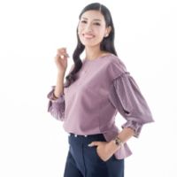 肌触りの優しいカットソーを使用したプルオーバーです。バストから腕にかけて、ラッフルを配してデザイン。