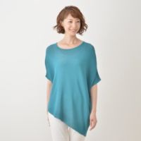 アシンメトリーデザインのニットプルオーバーです。レーヨンナイロン糸で薄手に仕上げ、サラッとTシャツ感覚で着られる一枚に。