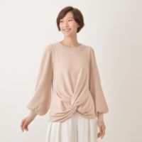 目を引くデザイン要素満載の、スタイリッシュなニットプルオーバーです。前身頃のウエスト部分は、オシャレなねじり仕様のデザイン。