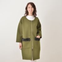 エコファー使いがポイントになったシンプルなノーカラーコートです。ふっくらとした、ややハリのある風合いが魅力のダンボールニット素材を使用。