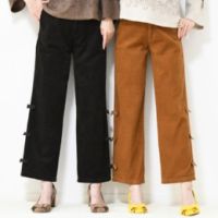 サイドにあしらったグログランテープのリボンがポイントになった、コーデュロイのパンツです。コーデュロイ素材のうねが細身なので色々なトップスに合わせやすく、コーディネートに取り入れやすいデザイン。