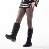フリルとリボン使いがキュートなロングブーツです。本体に高級感のある質感の柔らかいフェイクスエードを使用。