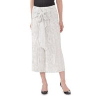 マニッシュな印象のストライプ柄を、フェミニンなリボン付きのパンツに仕上げました。トレンド感のあるワイドなシルエット。