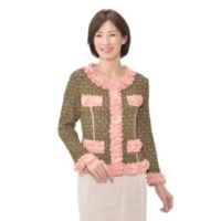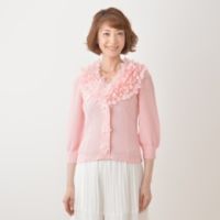 柔らかなシフォン素材の、ブラウスジャケットです。シフォンとチュールでお作りしたふわふわのフリルを、ショールカラー風にたっぷりと飾りました。