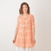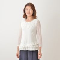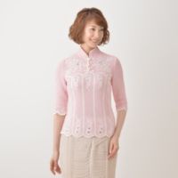 牡丹の花の刺繍を散りばめた華やかなプルオーバーです。スカラップと縦ラインのパッチワークが、シルエットをほっそりと見せてくれる効果も。