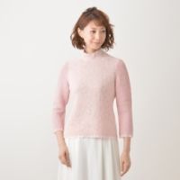 前身頃と衿に、毛足のあるジャカード素材を使用。ふわふわの手触りが心地よいプルオーバーです。後ろ身頃と袖は、滑りのよいタフタ素材を使用。