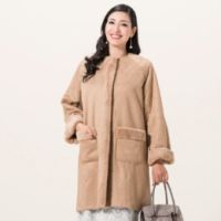 ふんわりと柔らかであたたかい、フェイクムートンのコートです。右前端を表側に折り返してフェイクファーをあしらった前立てが、縦ラインを強調してスッキリとしたシルエットを演出。