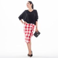 大柄のブロックチェック柄が目を引く、タイトスカートをご紹介します。フロントに立体感のあるフリルを挟み込み、さりげなく視線を縦に誘導。