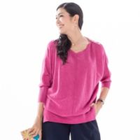 柔らかな糸で仕立てたドルマンニットプルオーバー。全体的にゆったりとして着心地楽ちんです。肩にあしらったパール調のボタンがアクセントで、左右内側の1個ずつは本開きで着脱しやすいデザイン。