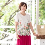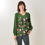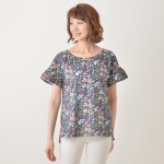 フロントの花柄プリントが目を引く、華やかなプルオーバーです。本体は、レーヨン混のとろみとしなやかさがあり、ストレッチ性に優れている天竺素材を使用。