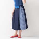 デニムダンガリーとストライプ生地の異素材を使用した、ブロッキングデザインのスカートです。レーヨン混のデニムダンガリーはやや艶感があり、カジュアル過ぎない印象に。