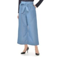 艶感のあるキレイめなダンガリー素材で仕立てた、エレガントなワイドパンツです。フロントの左右にタックを1本ずつ入れ、ウエスト周りをすっきりと。