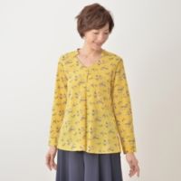 デシンに小花のブーケ柄をプリントした、華やかなブラウスです。襟元はスキッパータイプにして、お顔まわりをすっきりと演出。
