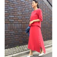左裾にアイレットを打った、ポンチ生地のロングスカートです。程よい厚みとハリ感があるので、体のラインを強調することなく着用可能。