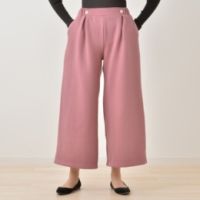ウエストのボタンとタックがポイントのワイドパンツ。ウエストは一部を幅広の総ゴムで仕上げ、窮屈感の少ない履き心地に仕上げました。