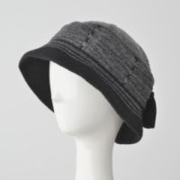 タックと配色ボーダーで編み上げたニットハットです。ポリエステル混の糸を使って、ツバ部分に張りを持たせ形を整えました。