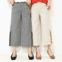 カジュアルなツイル生地と、女性らしいチュールの組合せが新しい、フェミニンなパンツのご紹介です。適度なストレッチ性のあるツイル生地を使用。