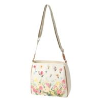 刺繍とプリントの競合を楽しめる、華やかなショルダーバッグをご紹介。チューリップとスイセンとワスレナグサのオリジナルデザインを、鮮やかな刺繍とプリントで表現しました。