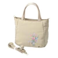 ブランドオリジナルのチューリップ柄刺繍をあしらった、上品な手提げバッグ。表地と裏地の間にはわたが入っており、柔らかな風合いです。