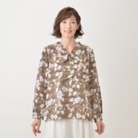 グレンチェックにフラワー柄を重ねた、前後2WAYのプリントブラウス。リボンタイのデザインで着用すれば、エレガントな女性らしい印象に。