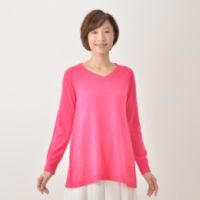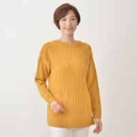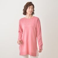 フロントサイドに入れた透かし編みが、華奢見え効果を演出するフェミニンなニットチュニックです。しなやかで柔らかな、12ゲージのハイゲージニット素材。