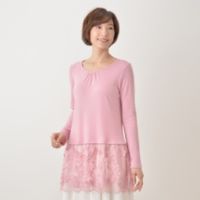 裾部分に立体感のある3Dレースをあしらった、1枚で華のあるチュニックです。身生地はなめらかでとろみも感じる肌あたりの心地よいスムース素材を使用。