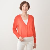 12ゲージの梳毛アクリル素材のニットで仕立てたカーディガン。ボレロ丈で足長効果のあるデザインです。やや光沢のある、きれいめな素材感。