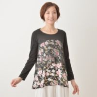 花柄プリントの生地にチュールを重ねた、デザインチュニックです。胸の切替えをラウンドにして柔らかな印象に。